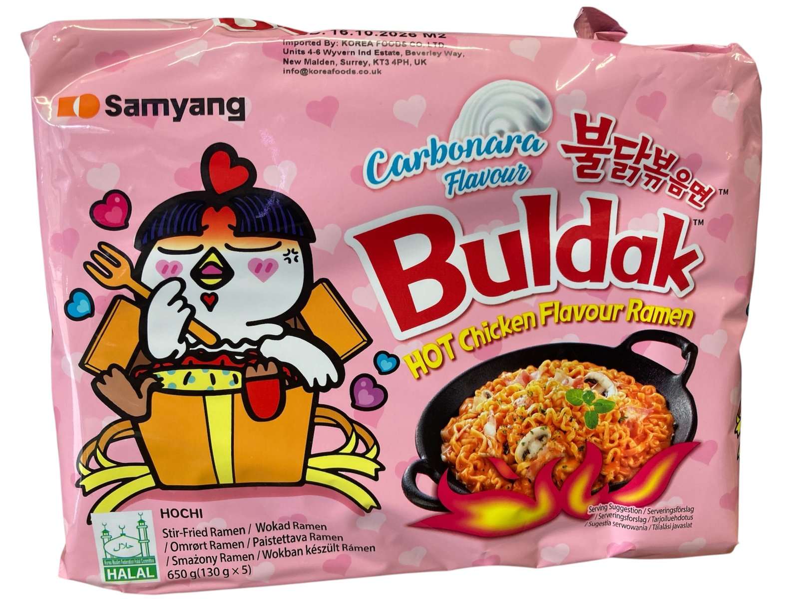 Individual pink packet of Samyang Buldak Carbonara Hot Chicken Ramen featuring Hochi mascot and Halal logo.🔥 Samyang Buldak Hot Chicken Carbonara Ramen Noodles 130g – Pack of 5