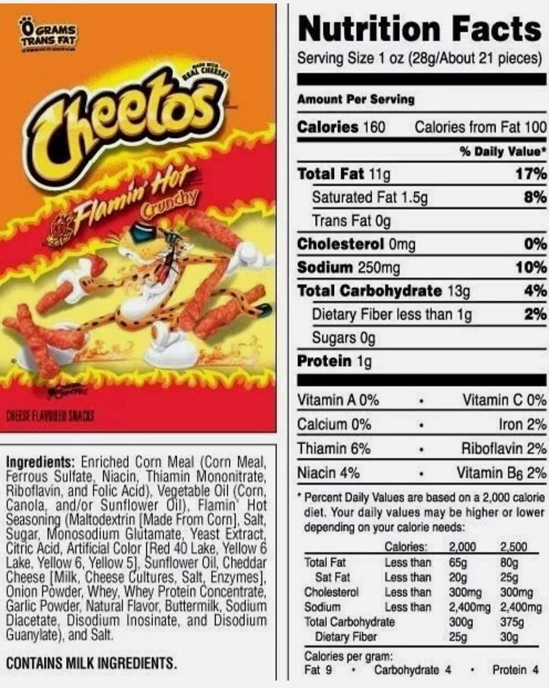Ingredients: Enriched Corn Meal, Vegetable Oil, Flamin’ Hot Seasoning, Salt, Sugar, Yeast Extract, Citric Acid, Artificial Colours (E129**, E110**, E102**), Sunflower Oil, Cheddar CHEESE, Onion Powder, Whey, Garlic Powder, Natural Flavour, BUTTERMILK, Salt.