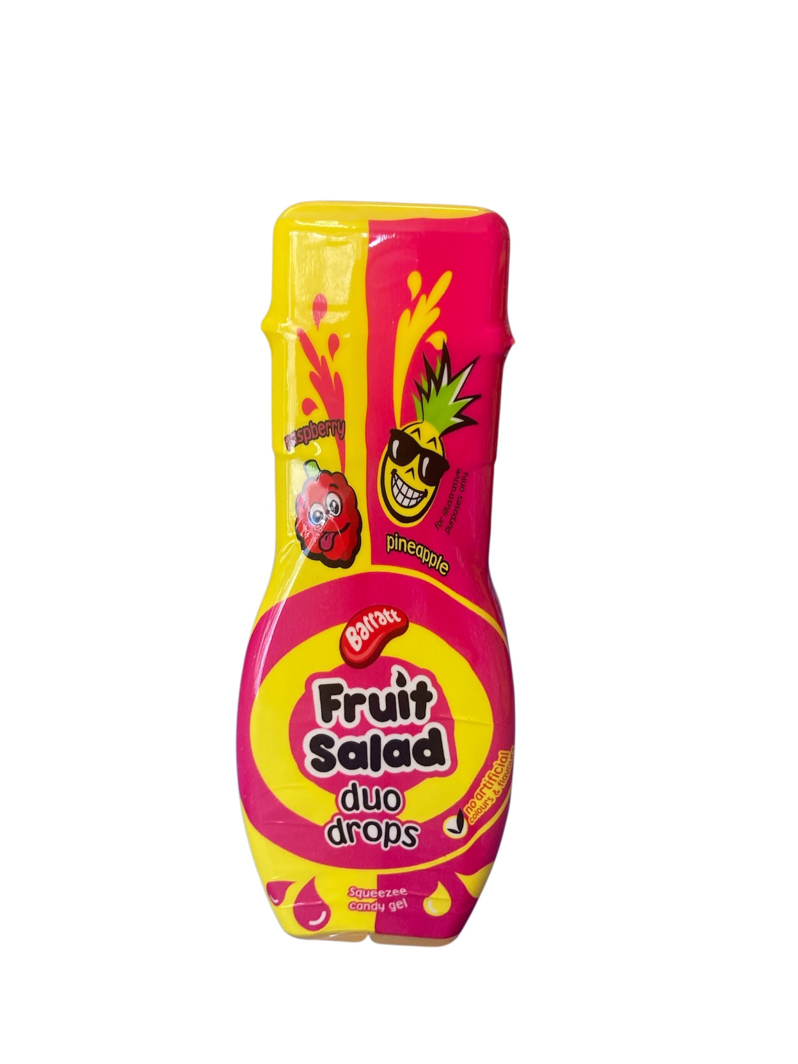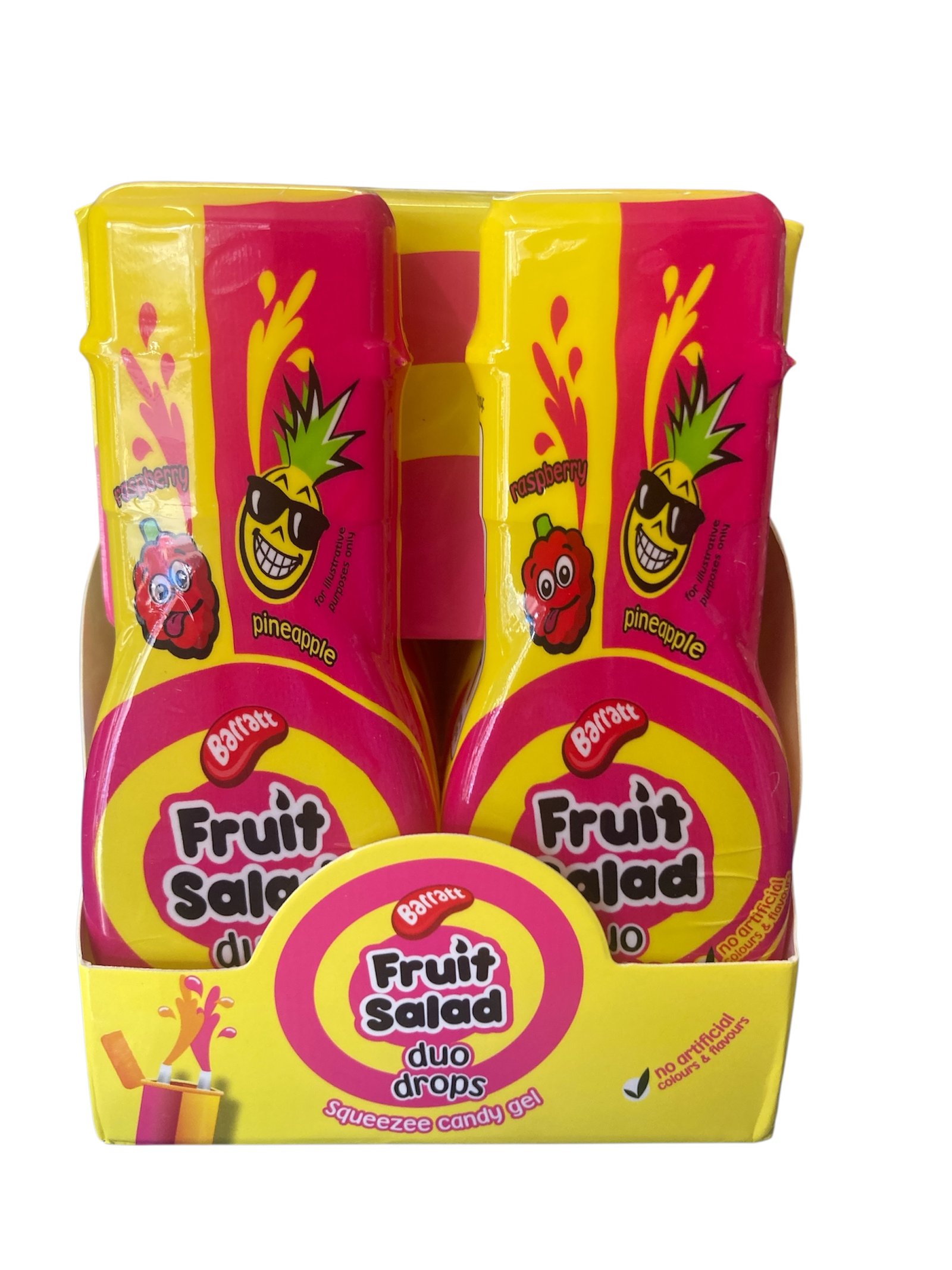 Enjoy a burst of fruity fun with Barratt Fruit Salad Duo Drops 36ml. These novelty liquid candy drops combine the classic raspberry and pineapple Fruit Salad flavour in a fun squeeze bottle. Each pack contains 12 bottles, perfect for party bags, sweet shops, or a tasty on-the-go treat. Suitable for vegans and vegetarians. 🍬
