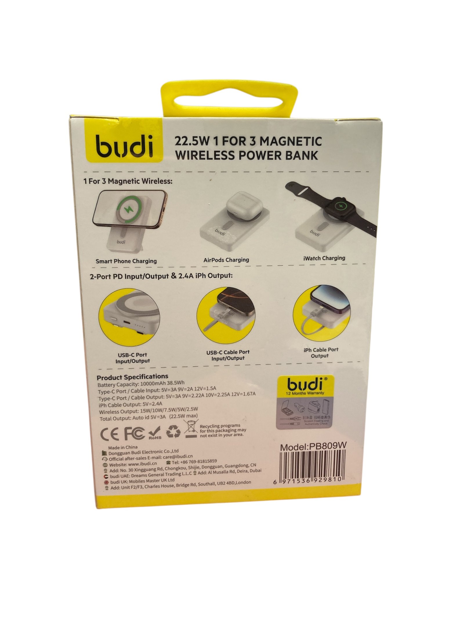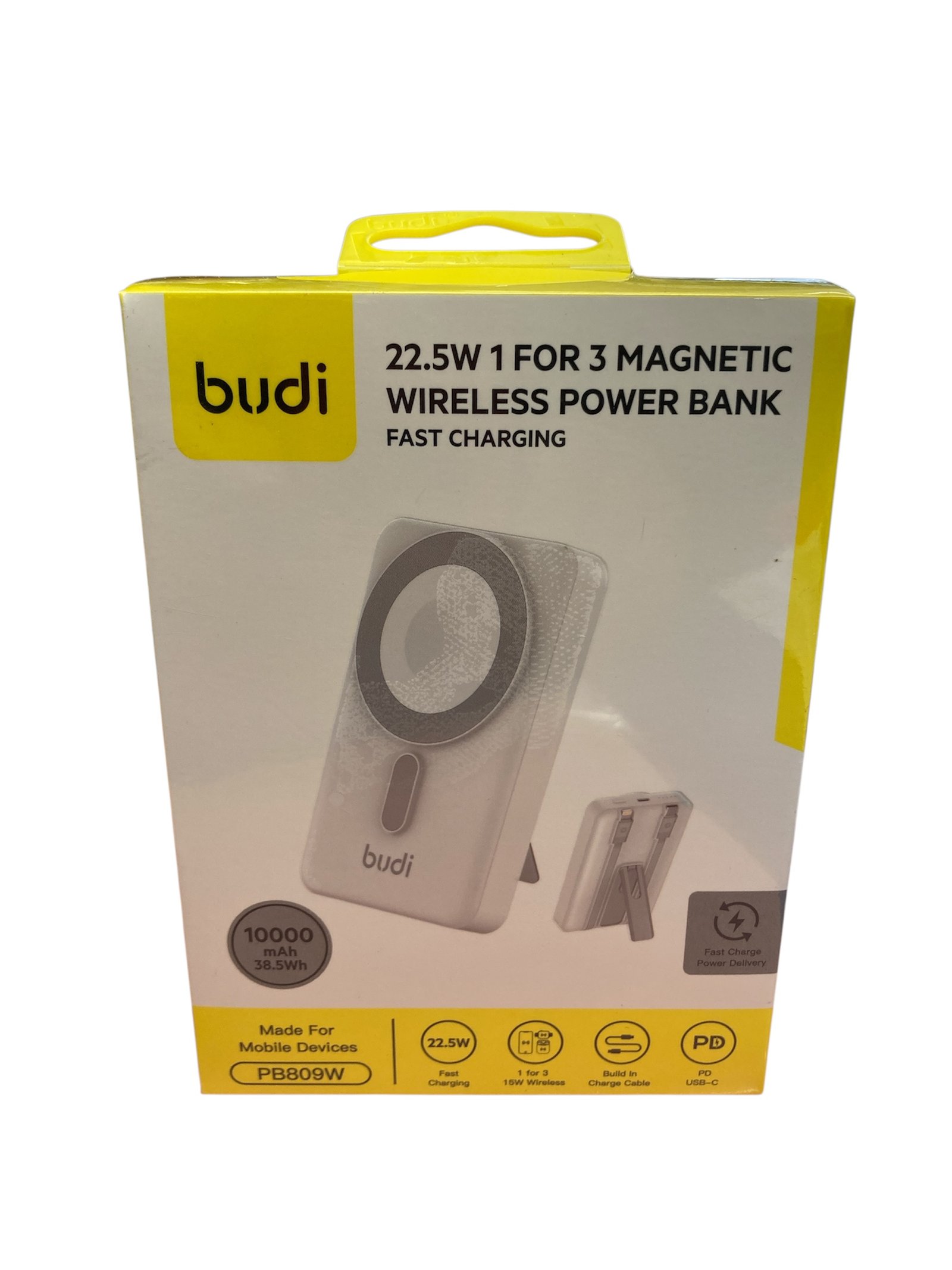 The BUDI PB809W 10000mAh (38.5Wh) magnetic wireless power bank delivers powerful 22.5W fast charging with 3-in-1 functionality. Charge wirelessly or via cable, attach magnetically to compatible devices, and enjoy compact, travel-ready portable power.