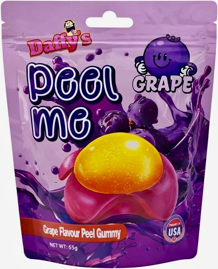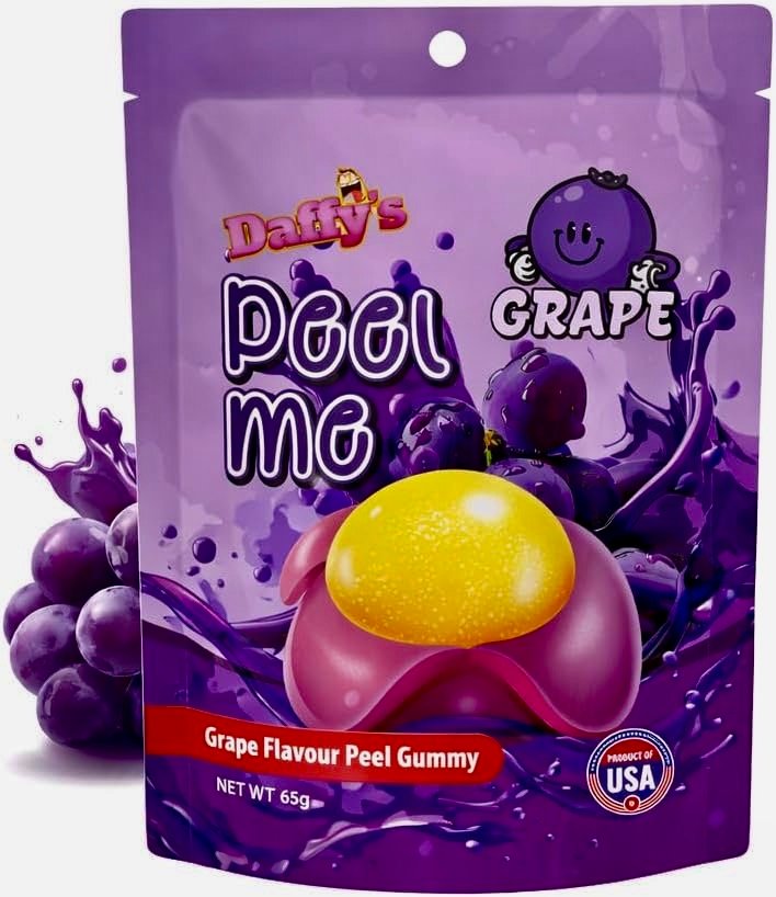 A 65g purple bag of Daffy’s Peel Me Grape Gummy Candy, featuring soft, peelable, and halal-certified grape-flavored gummiesDaffy’s Peel Me Grape Flavour Gummy Candy peeling sweets real fruit juice, 65g (Grape) Halal