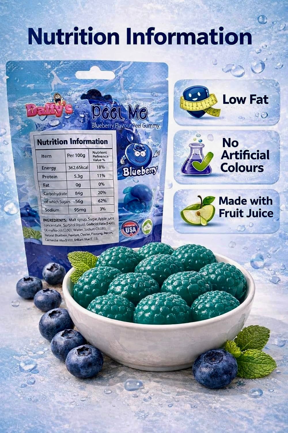 Daffy’s Peel Me Mango Flavour Peel Gummy Candy – Blueberry (65g) is a fun and chewy peelable sweet made with real fruit juice and mango purée. Bursting with blueberry flavour and crafted with Halal-certified beef gelatin, these gummies offer an interactive peel-and-eat experience. Perfect for snacking, sharing, parties, or gifting in a convenient 65g pack.