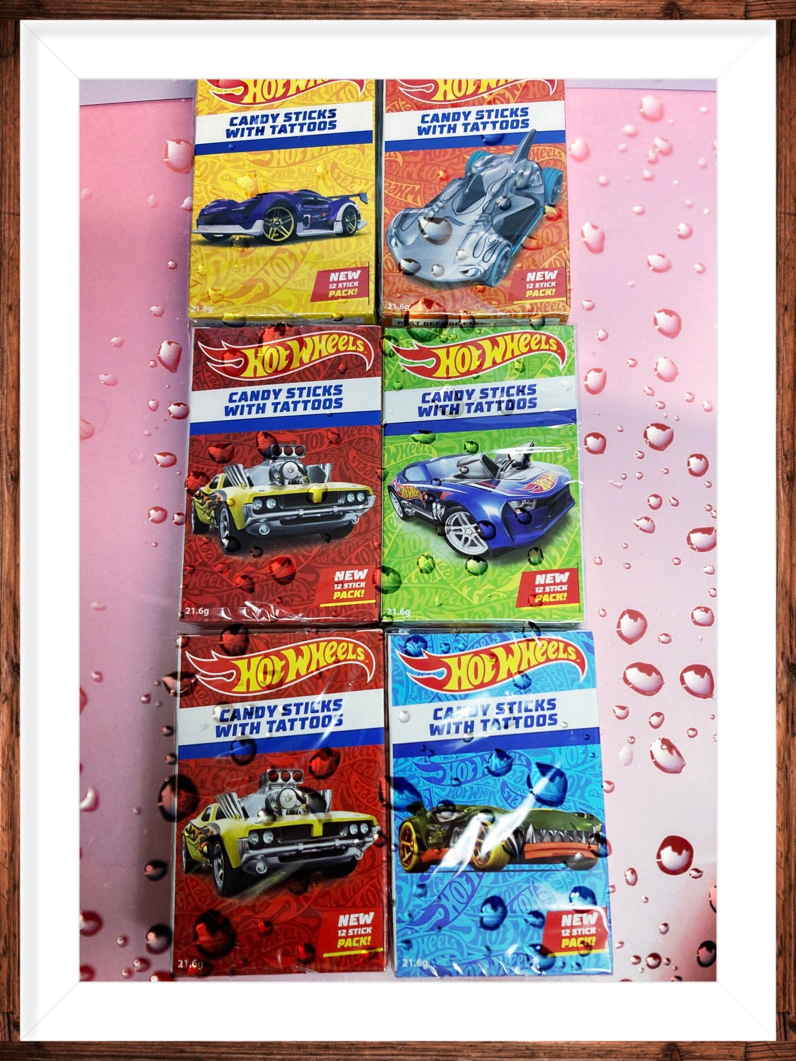 Fruit flavour candy sticks with Hot Wheels® temporary tattoo. 60 × 21.6 g packs. Fun, fruity, and collectible.