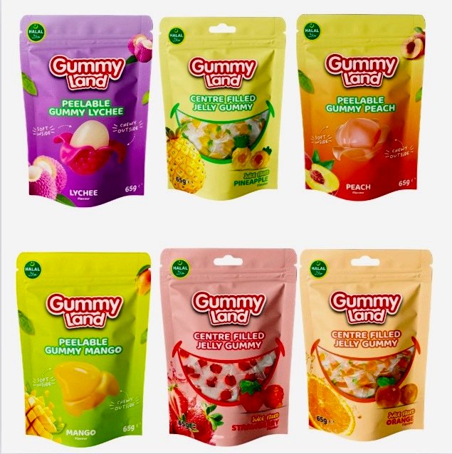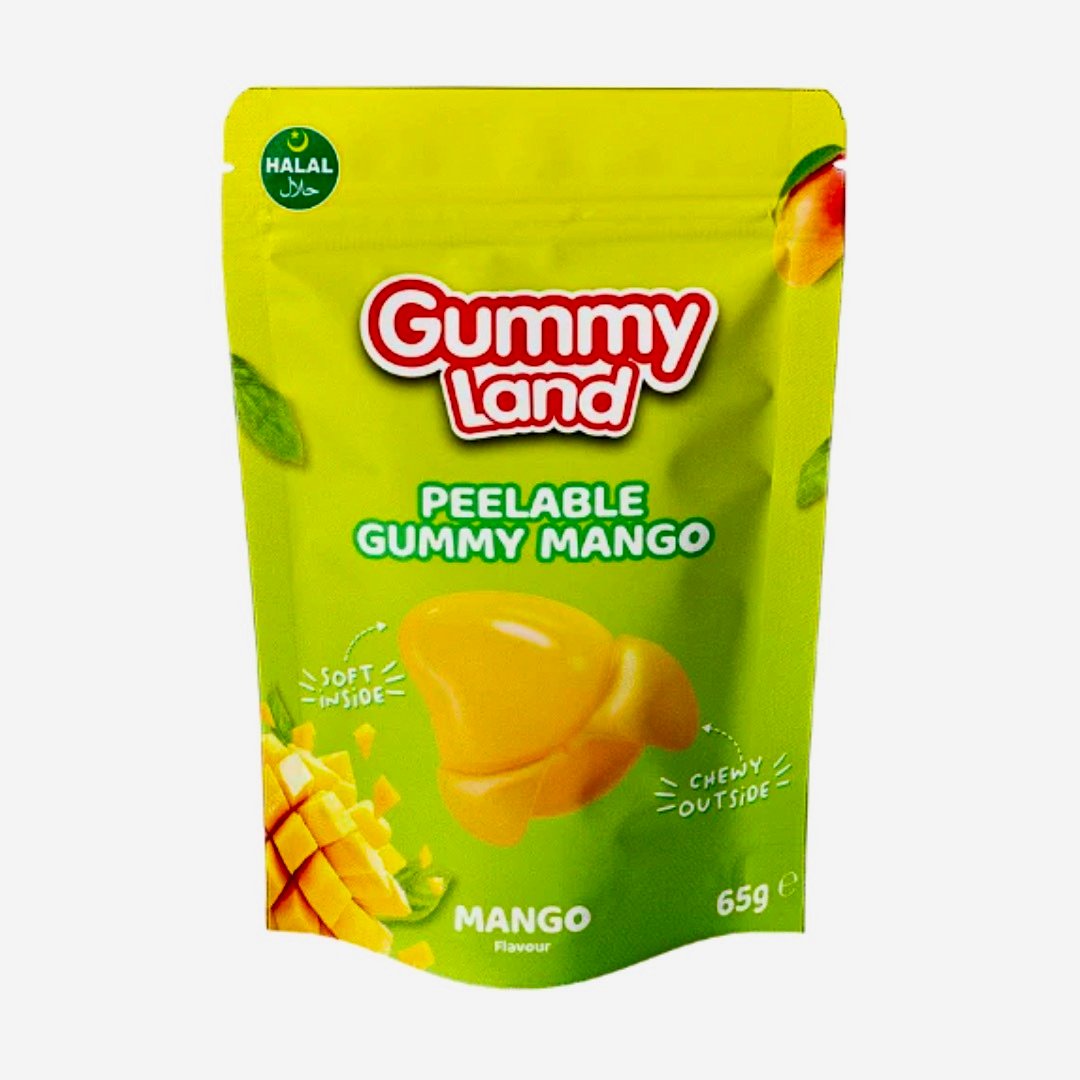 Peelable Gummy Land Mango Gummies with a juicy jelly-filled centre. Tropical flavour, fun texture, and Halal certified. Supplied in a 65g grab-bag.