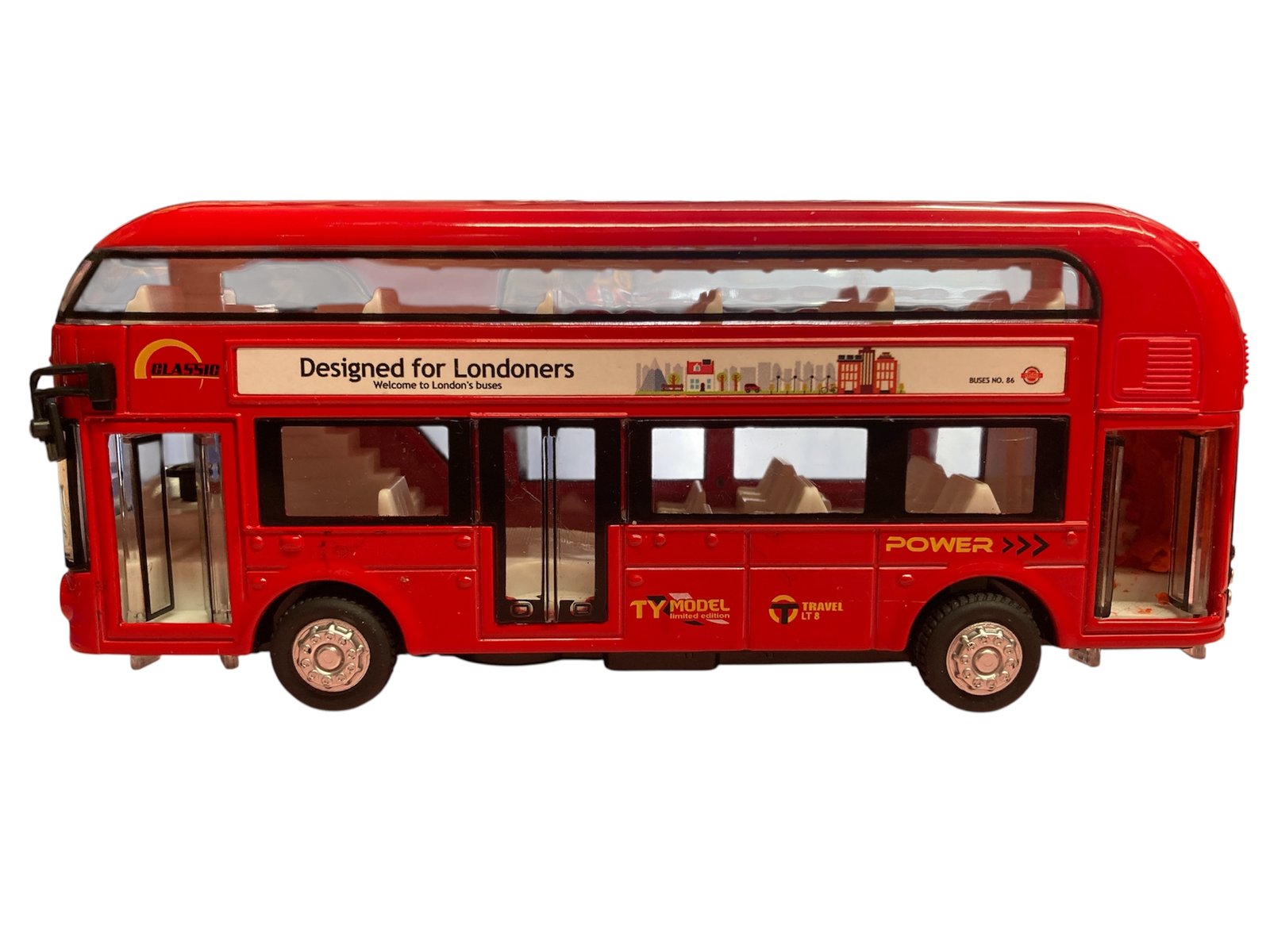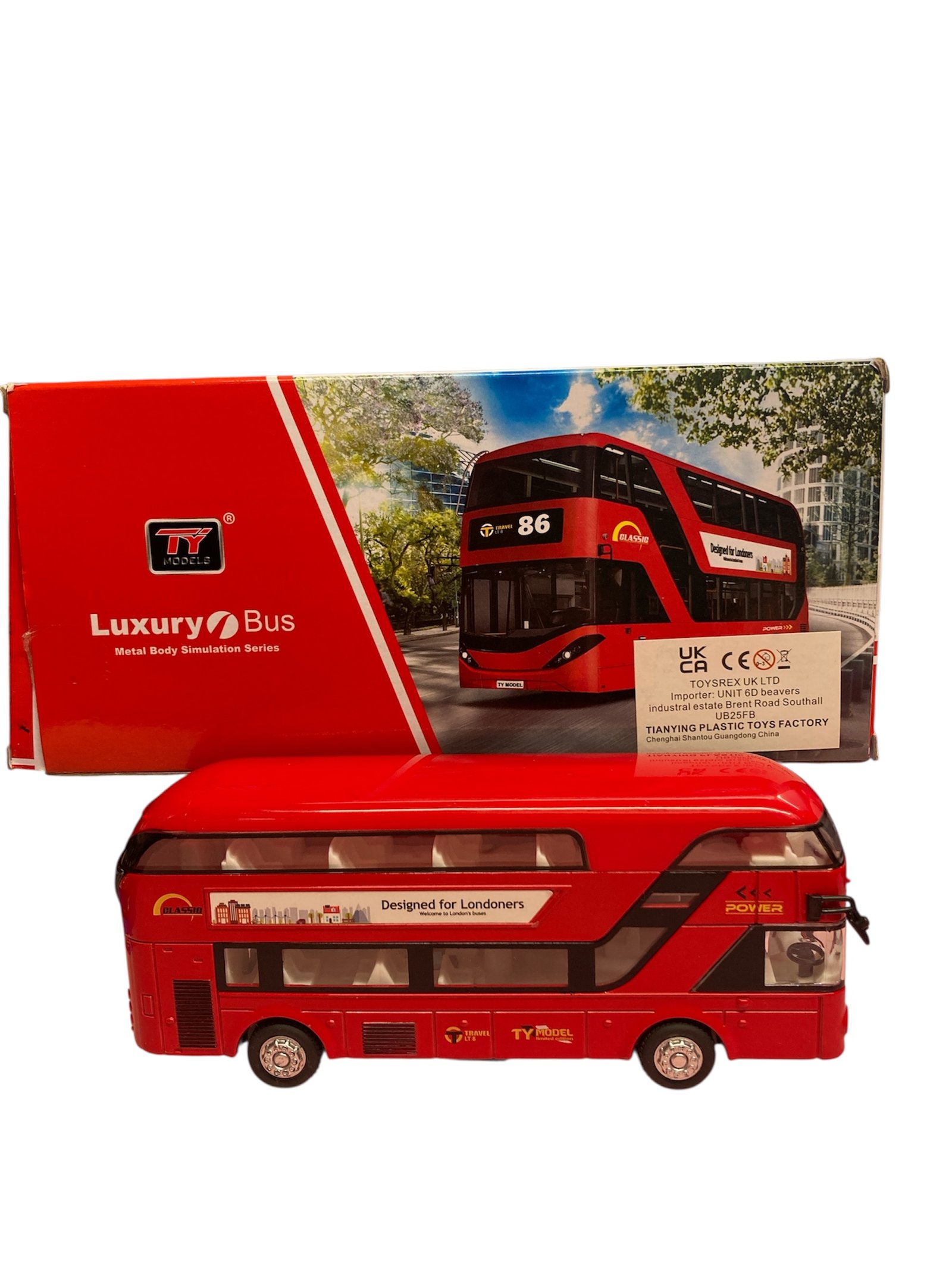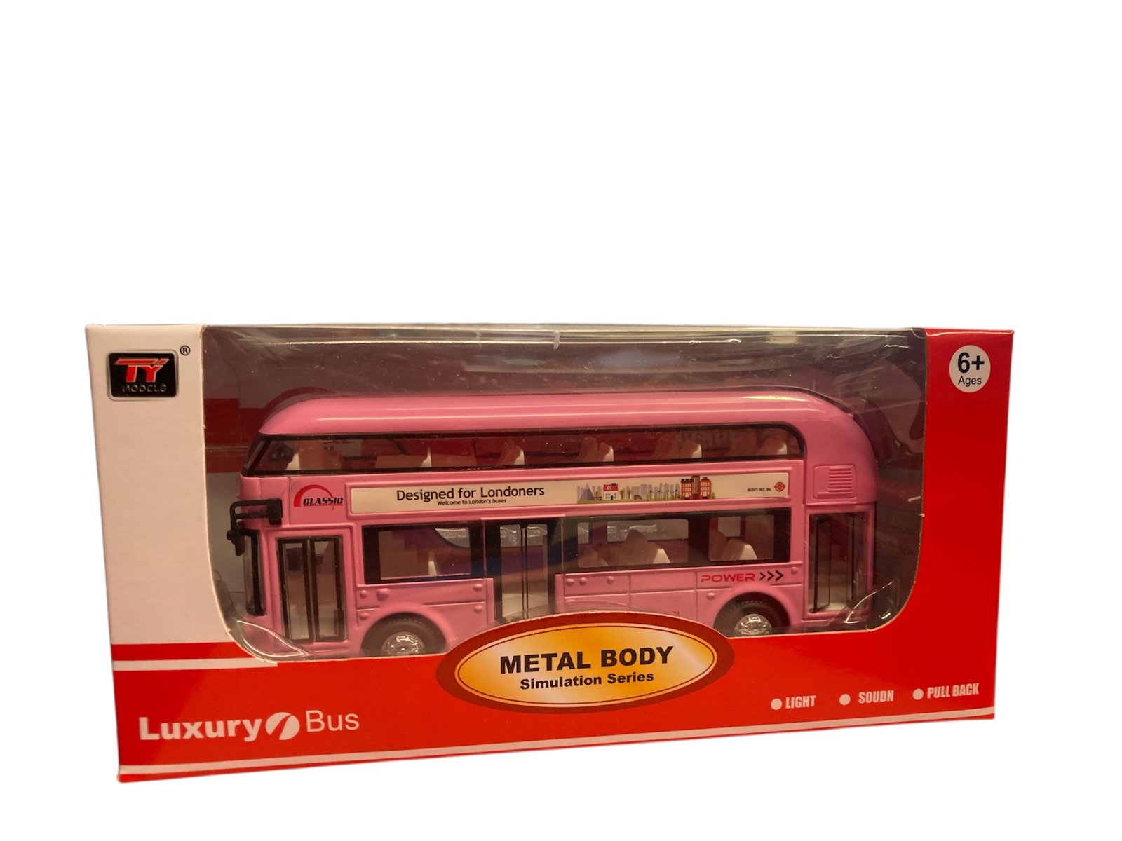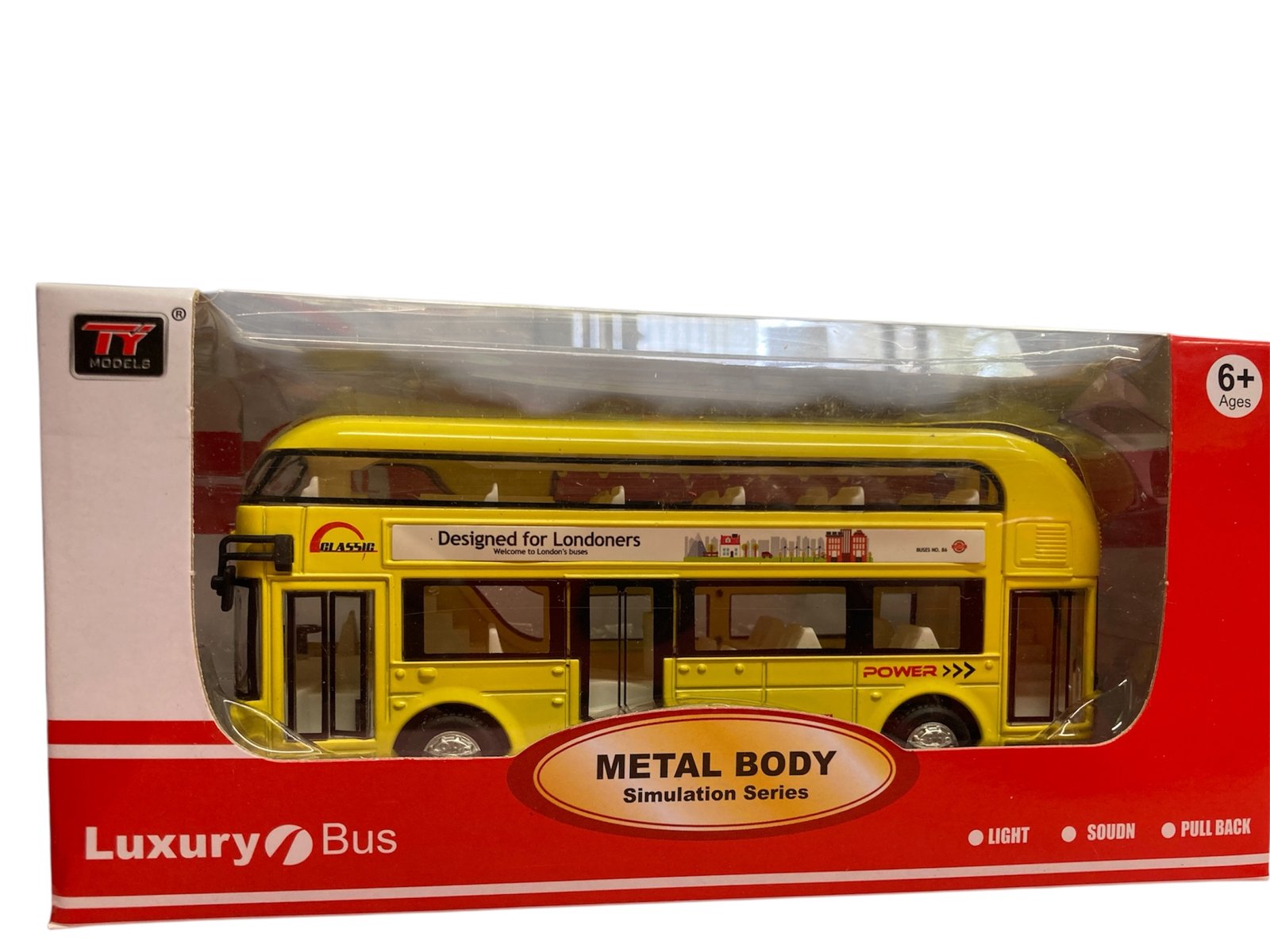 & Free ShippingMetal Body London Double Decker Bus with pull-back action, light & sound effects. Durable alloy construction. Available in Red, Orange & Yellow. Uses non-rechargeable batteries (not to be recharged).