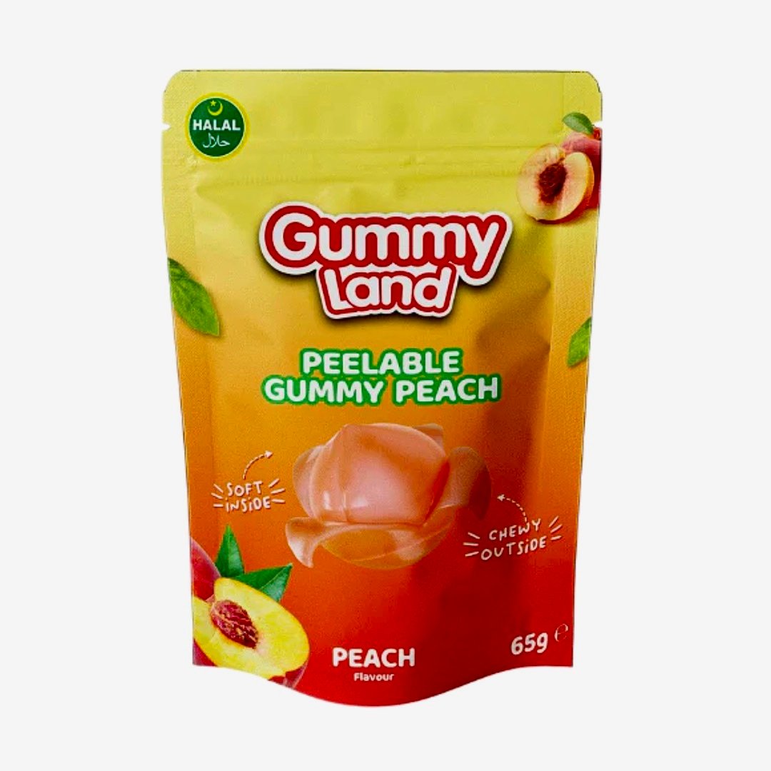 Peelable Gummy Land Peach Gummies with a juicy jelly-filled centre. Sweet fruit flavour, fun texture, and Halal certified. Supplied in a 65g grab-bag.