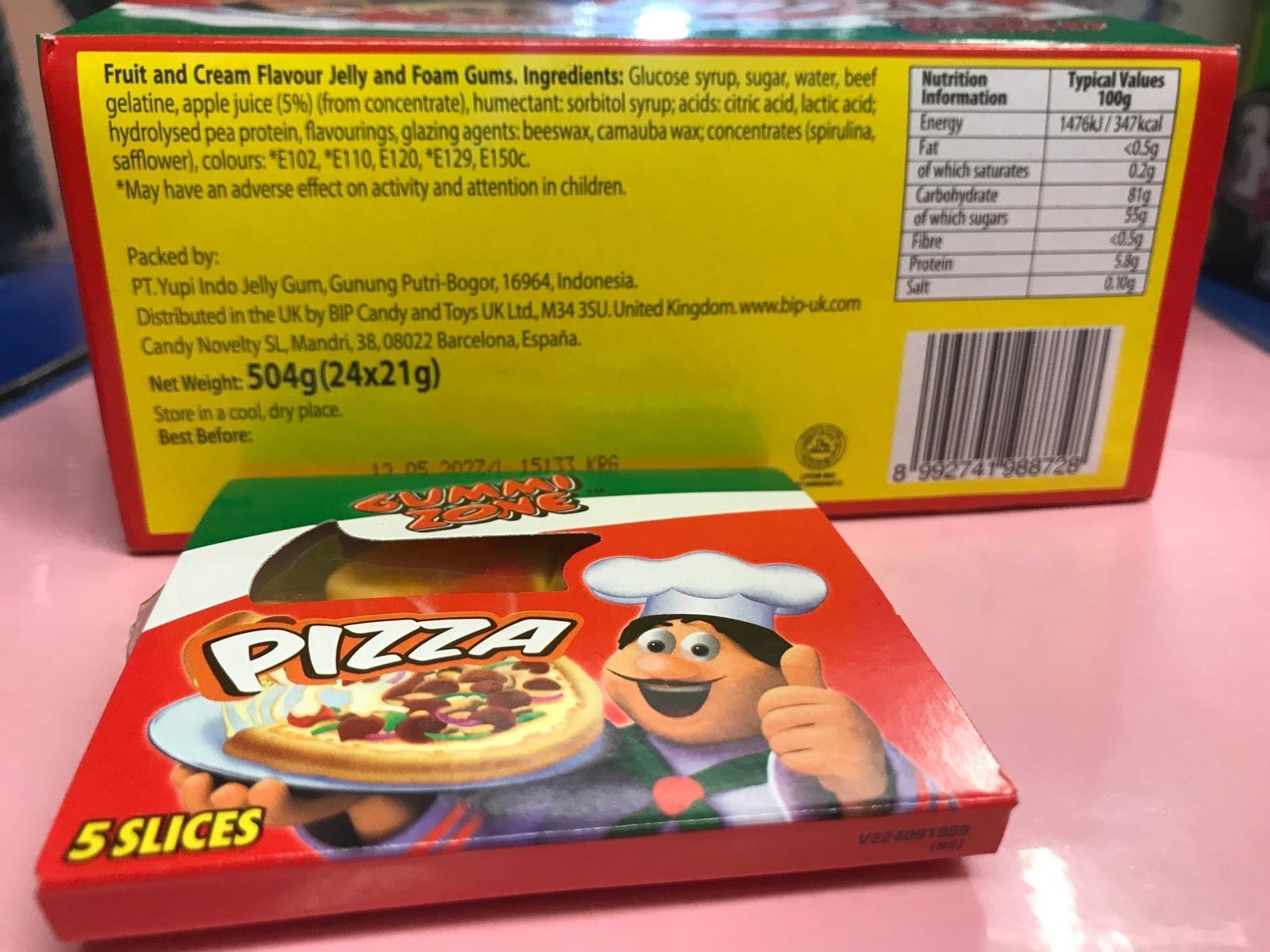 5 slices in every pizza, Fruit and cream flavour jelly and foam gums.