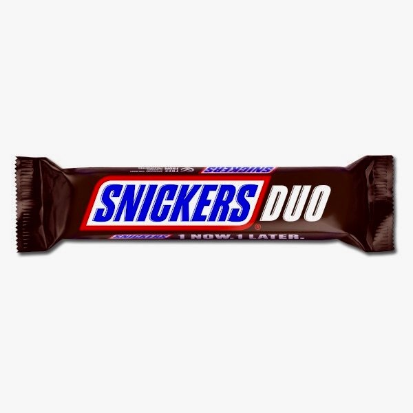 A Snickers Duo chocolate bar wrapper containing two individual bars filled with peanuts, caramel, and nougatSnickers Duo Chocolate Bar – Peanuts, Caramel & Nougat (2 Bars Pack)